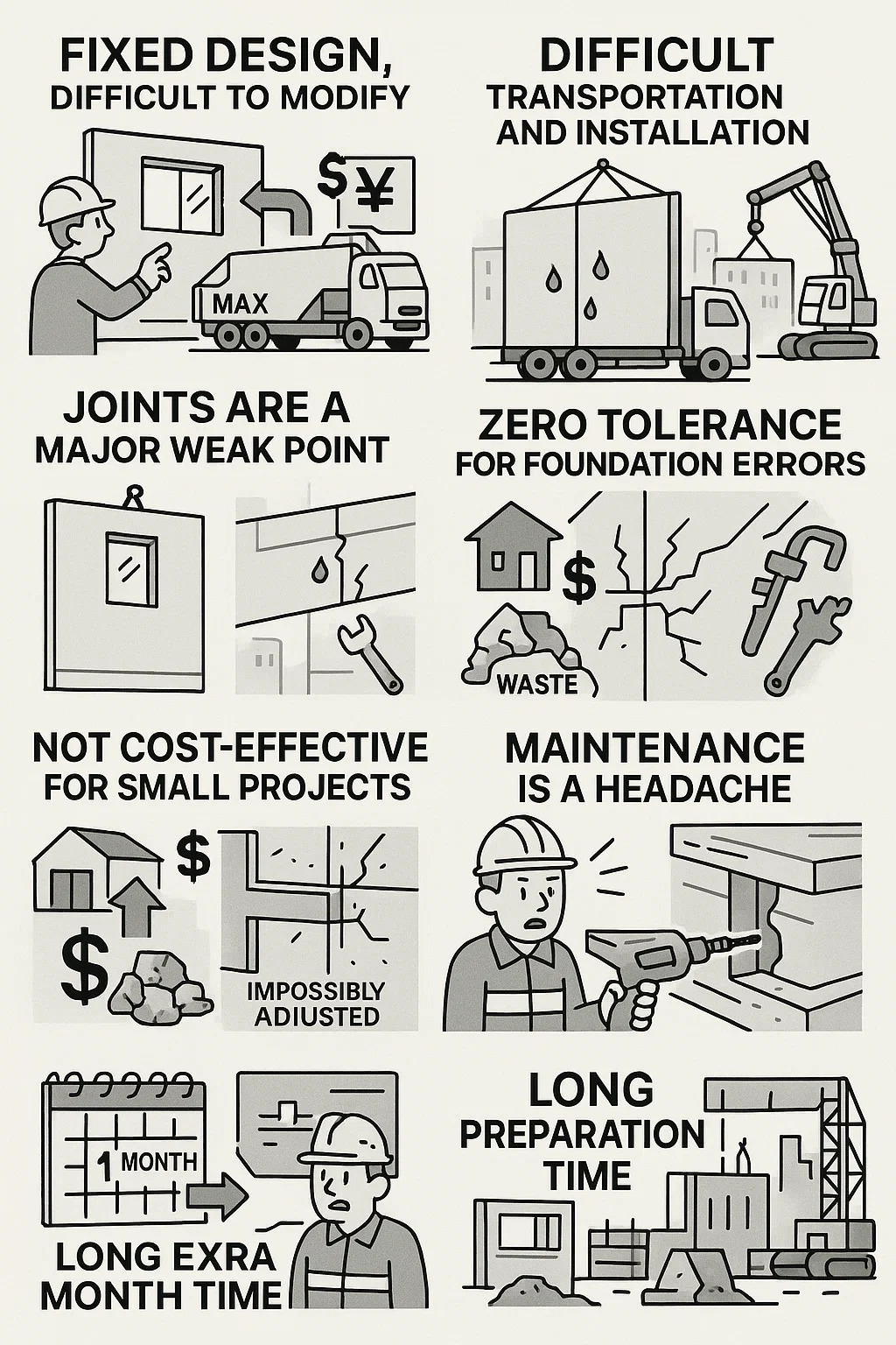 Limitări stricte de dimensiune: dimensiunea maximă a componentelor este limitată de constrângerile de transport (de exemplu, un camion nu poate transporta un panou de perete de 4 metri lățime), ceea ce face imposibilă formele complexe.