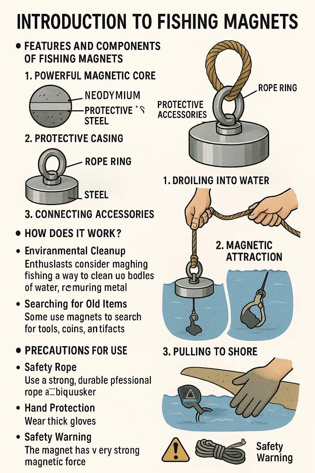 Utilizatorul aruncă magnetul de pescuit, cu frânghia atașată, în corpuri de apă precum râuri, lacuri, fântâni sau docuri.