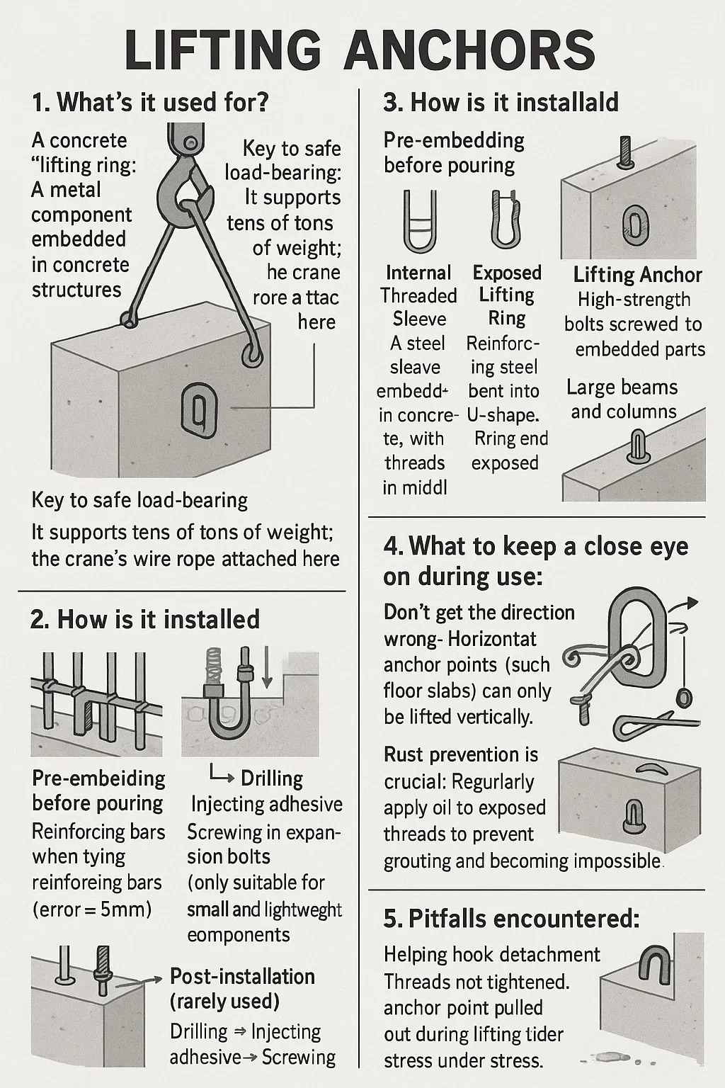 Un „inel de ridicare” din beton: O componentă metalică încorporată în structuri de beton (panouri de perete, scări, grinzi). Cârligele sau șuruburile sunt înșurubate direct pe acesta pentru ridicare.